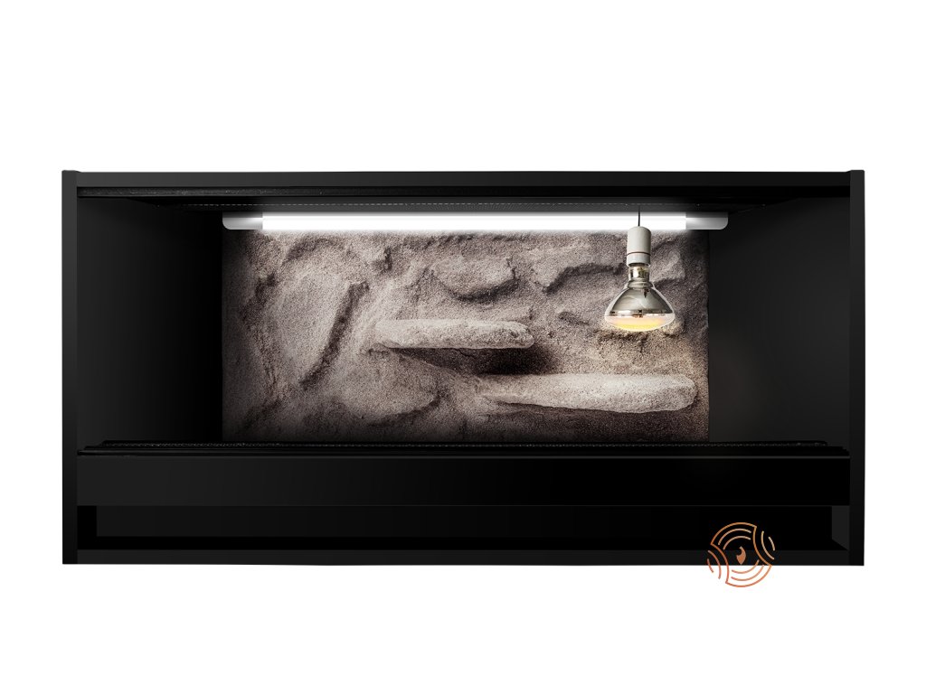 Mezi hlavní výhody patří velká odolnost těchto terárií, výborná tepelná izolace a v neposlední řadě snadná instalace doplňků. K těmto teráriím nabízíme opískované a modelované 3D stěny. Součástí může být skříňka, nebo stolek.